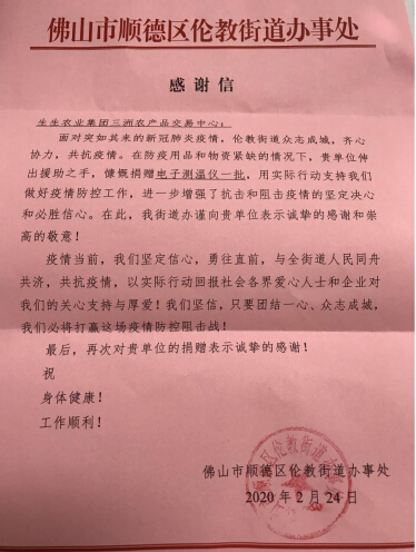 新冠無情,人間有愛。2020年,面對突如其來的肺炎疫情,在全球防疫用品和物資短缺的情況下,三洲農產品交易中心分別在2月19日、2月24對倫教街道辦事處伸出緩手、雪中送炭。農批中心何錦坤總經理及市場運營部梁俊熒副總經理,赴辦事處親手捐贈一批電子測溫儀及1萬個愛心口罩,用實際行動支持社會對抗疫情,做好防控工作。街道辦領導代表對此表示誠摯的感謝和崇高的敬意。