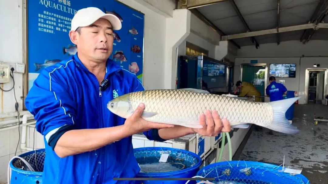 經過一上午的忙碌,梁衛洪和工人們將精心挑選的草魚送到專門的作業區,在這邊待裝箱出口的草魚將接受最后一次檢測,梁偉洪表示,每一條草魚從送進基地開始到裝箱出口,都要經過三輪肉質與藥殘檢測。